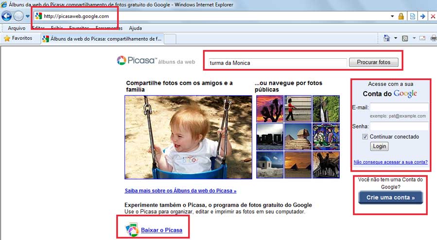 Na imagem abaixo estão marcados os locais importantes: endereço, caixa de procura, acesso à conta, criação de conta e o link para o download do programa Picasa.